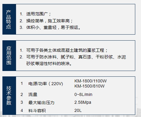 KM-1500是使用國(guó)外先進(jìn)的螺旋泵送技術(shù),并結(jié)合國(guó)內(nèi)實(shí)際施工需求而開(kāi)發(fā)出的一種新型灌漿與噴涂?jī)捎脵C(jī)械。